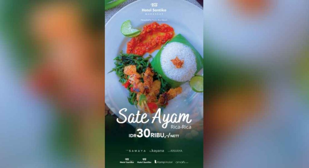 INKAM, MAKASSAR – Sambut liburan idul Adha serta liburan anak sekolah, Hotel Santika Makassar menawarkan menu promo food Sate Ayam Rica- Rica, yang  dibandrol Rp30.000net/porsinya.