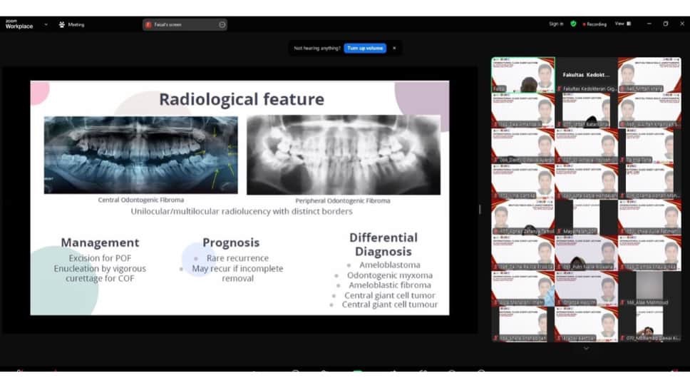 Kuliah daring yang berlangsung pada Selasa (05/11) ini dimulai pukul 08.00 WITA, dengan topik “Benign Lesion of The Jaw”, yang membahas berbagai jenis lesi jinak pada rahang, termasuk ciri khas klinis, diagnosis, dan pendekatan penanganan yang efektif.