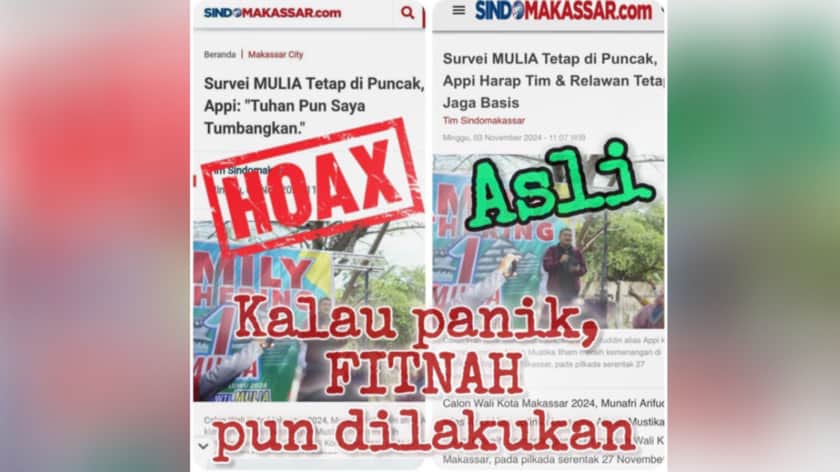 Dalam gambar yang tersebar, judul asli berita “Survey Tetap di Puncak, Appi Harap Tim & Relawan Tetap Jaga Basis” telah diganti oleh oknum tak bertanggung jawab menjadi “Survey Tetap di Puncak, Appi: ‘Tuhan Pun Saya Tumbangkan’”.