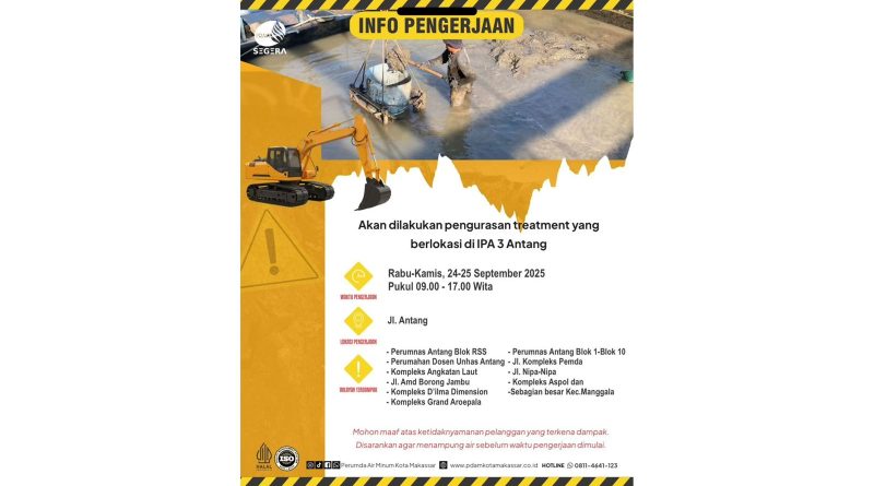 Baca SelengkapnyaMAKASSAR, INKAM – Perumda Air Minum Kota Makassar akan melakukan pengurasan treatment di Instalasi Pengolahan Air (IPA) 3 Antang pada